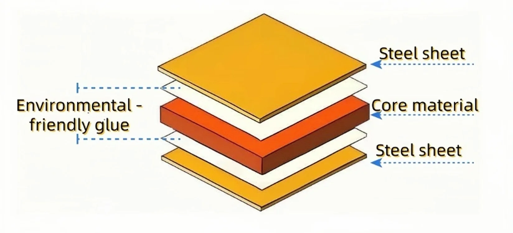 Core materials (such as rock wool, polystyrene, etc.) have low thermal conductivity, which can effectively block heat transfer and meet the temperature control needs of different climatic regions.