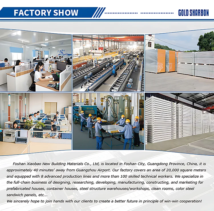 Foshan Xiaobao New Building Materials Co., Ltd. is a leading prefabricated house manufacturer in Foshan, China, with a 20,000 sqm factory and 6 advanced production lines. Specializing in full-chain prefabricated houses, container houses, and steel structure solutions, the company has passed ISO9001:2015 certification and exported to 80+ countries. With 60 skilled workers and a focus on quality and innovation, Xiaobao offers durable, eco-friendly, and fire-resistant solutions for global clients.